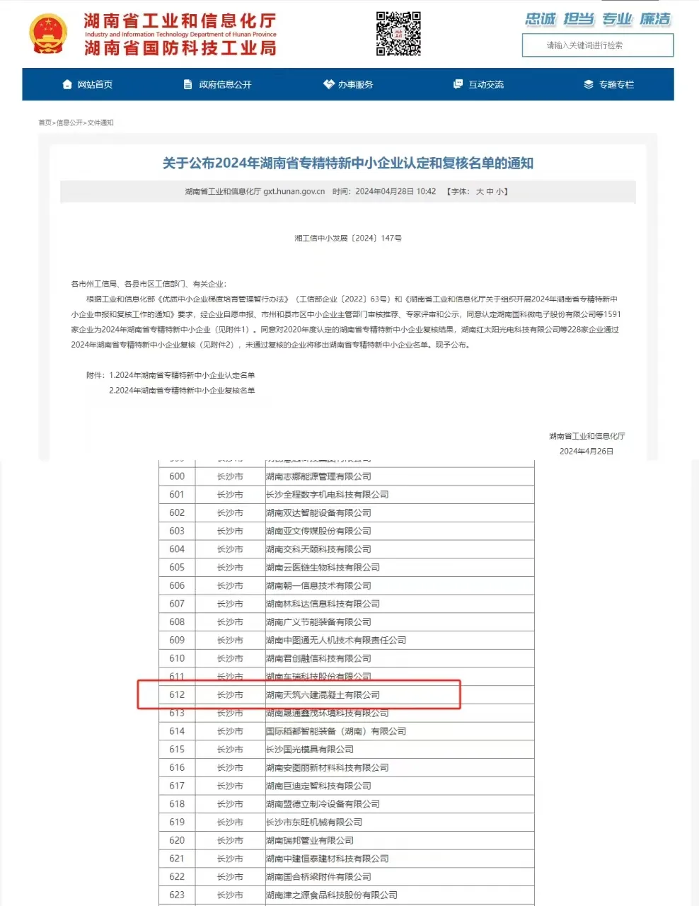 近日,湖南省工业和信息化厅公布“2024年湖南省专精特新中小企业名单”,九游会老哥必备的交流社区集团子公司湖南天筑六建混凝土有限公司凭借其在行业科技领域的卓越贡献与创新实践荣列其中,成为湖南省“专精特新”中小企业的一员。