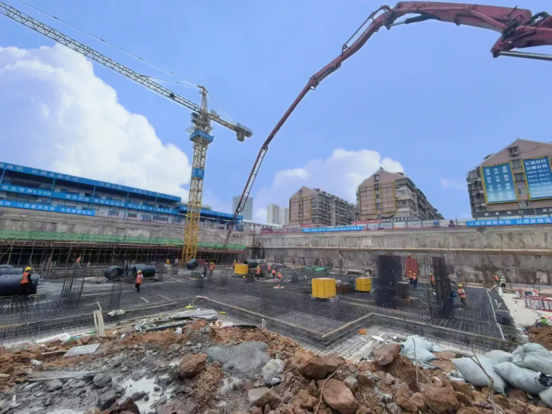 该项目地理位置特殊,位于雨花区高桥市场内,为确保混凝土施工的顺利进行,公司聚焦车流人流高度集中、道路安全状况复杂等难点,发挥战斗堡垒作用,联合中建五局对现场管理人员、作业班组进行大体积混凝土浇筑的安全技术交底工作。